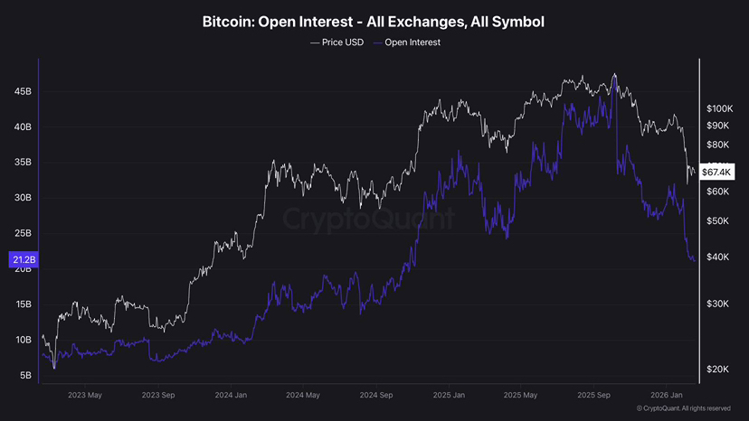 The Open interest of Bitcoin has declined by approximately 55 percent since its high in October in 2025 and some sources refer to it as the largest decline since April 2023.