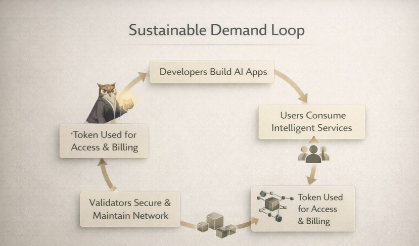 This is important since it begins to equate token demand to real product utilization rather than speculations. The token is used when users or developers need to buy tokens on a regular basis to get a more advanced use of AI the same way businesses pay to use APIs or cloud computing. This transformation seems more of a software economy than an archetypal blockchain gas model.