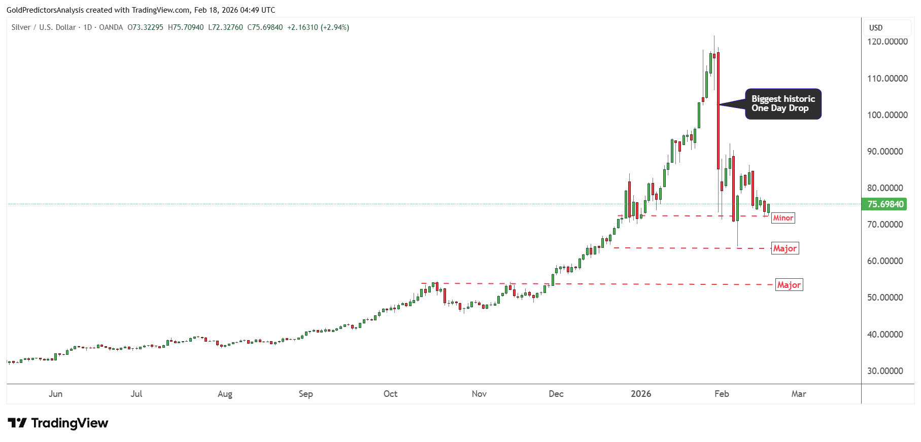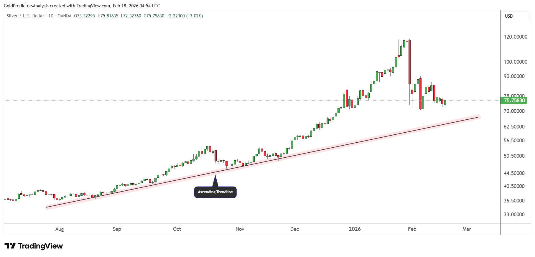 The strong uptrend in silver is also evident in the ascending trend line, which is drawn from the July 2025 lows and trending upward. The major support of this trend line lies around $60-$64, which has already hit and price is preparing for next move.