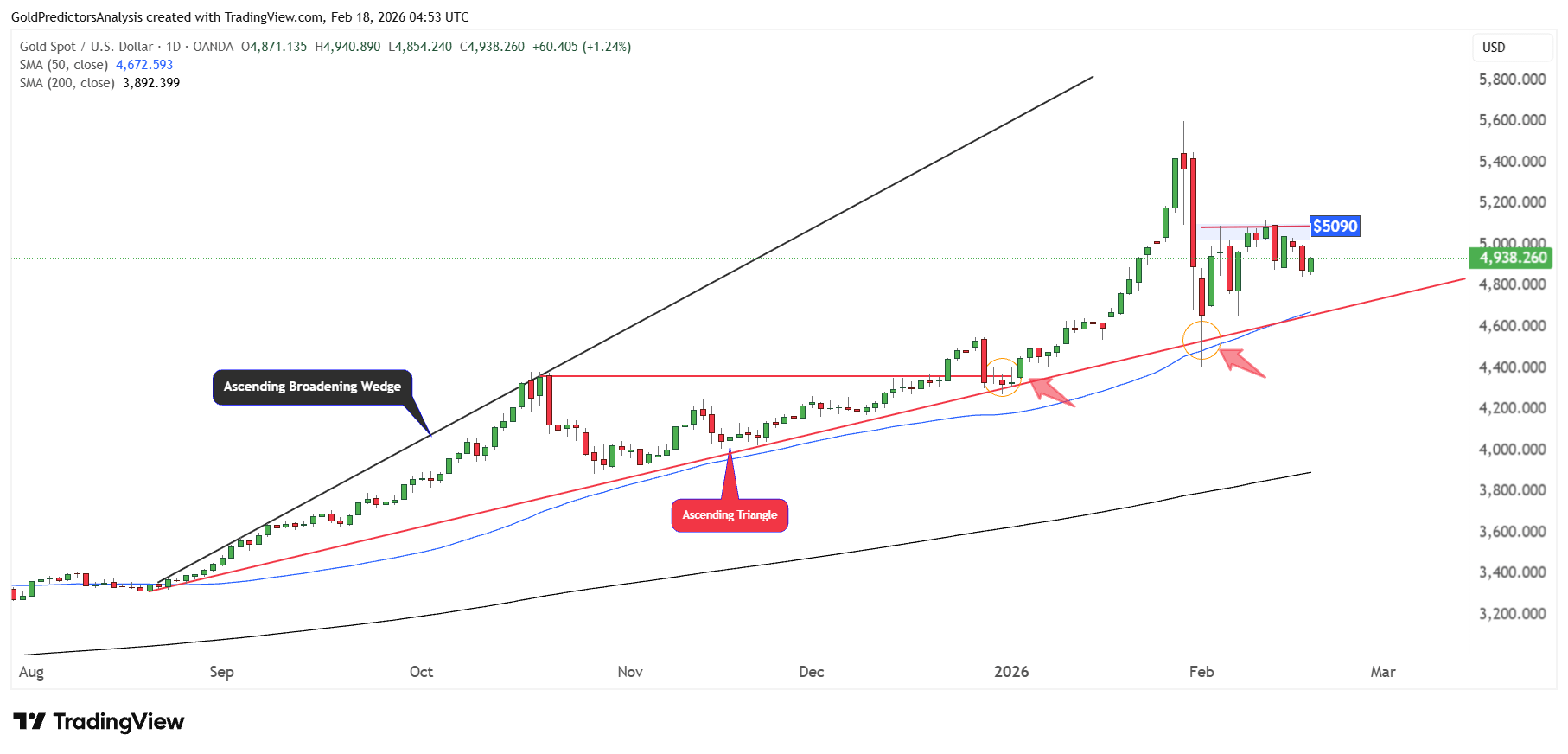 The daily chart for spot gold shows strong consolidation below $5,090. This consolidation indicates positive price action in gold since the price is consolidating above the 50-day SMA and within the ascending broadening wedge pattern.