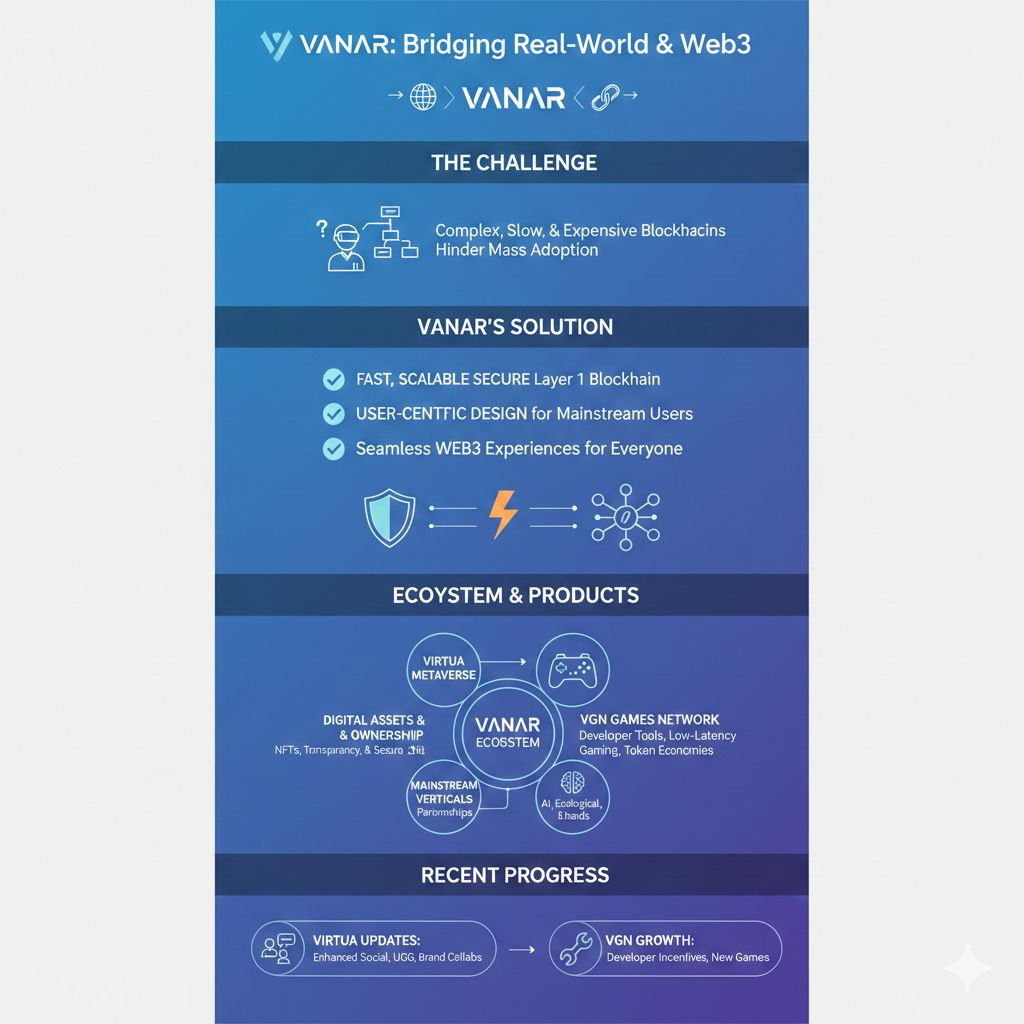 blockchain built to bridge the gap between blockchain technology and real-world adoption. Unlike many existing blockchain networks that prioritize niche applications or purely financial use cases, Vanar is designed from the ground up to cater to mainstream users, including gamers, content creators, brands, and consumers entering the Web3 ecosystem for the first time. The core challenge that Vanar addresses is the disconnect between blockchain capabilities and the needs of everyday users. Many existing networks are either too complex, too slow, or too expensive for mass adoption, creating a barrier for the next wave of global consumers. Vanar aims to remove these barriers by offering a blockchain environment that is fast, scalable, secure, and versatile, providing tools and infrastructure that make Web3 experiences seamless and engaging.