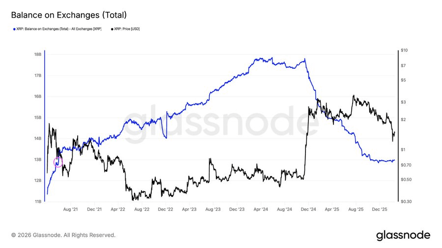$XRP supply on exchanges has dropped to a five-year low as holders moved tokens to self-custody, possibly signaling reduced selling pressure.
