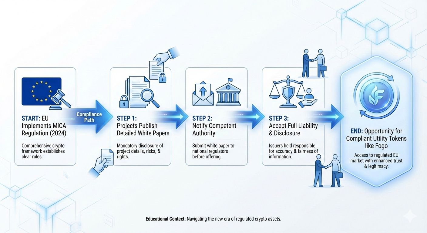 MiCA forces projects to choose: treat tokens as utilities with clear access rights or face securities-like scrutiny. Fogo's approach—decentralized protocol, no issuer, utility-only classification, detailed white paper—reduces delisting risk on EU platforms and builds trust.