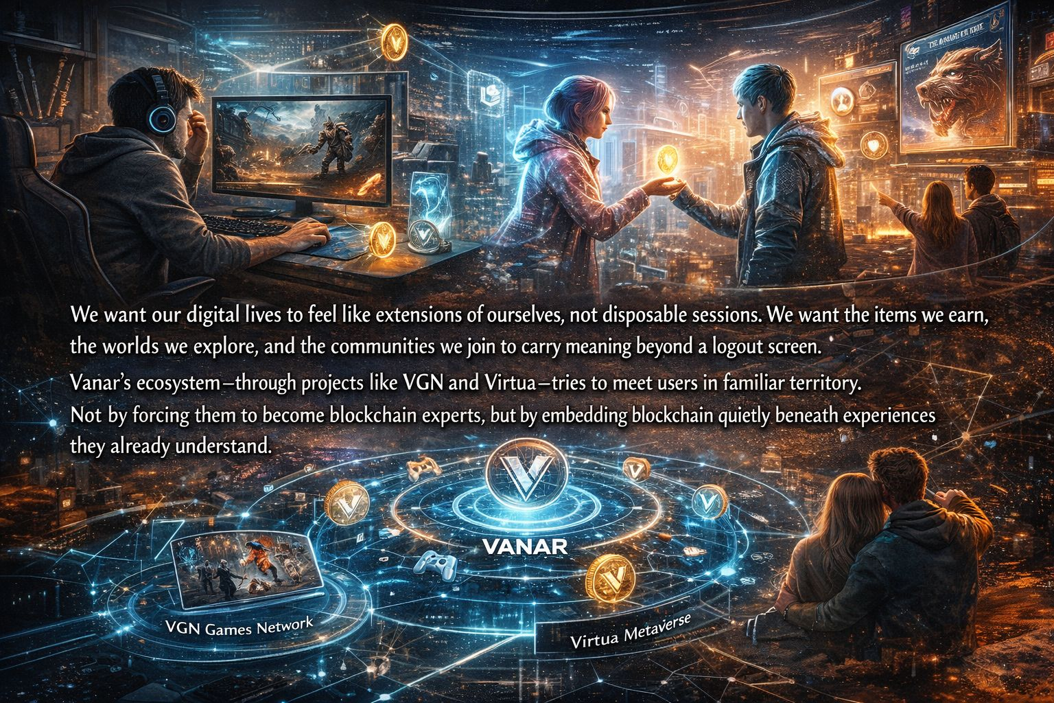We want our digital lives to feel like extensions of ourselves, not disposable sessions. We want the items we earn, the worlds we explore, and the communities we join to carry meaning beyond a logout screen. Vanar’s ecosystem—through projects like VGN and Virtua—tries to meet users in familiar territory. Not by forcing them to become blockchain experts, but by embedding blockchain quietly beneath experiences they already understand.