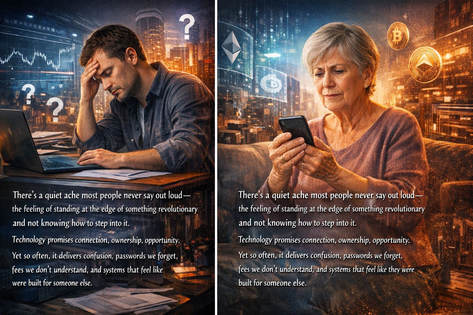 There’s a quiet ache most people never say out loud—the feeling of standing at the edge of something revolutionary and not knowing how to step into it. Technology promises connection, ownership, opportunity. Yet so often, it delivers confusion, passwords we forget, fees we don’t understand, and systems that feel like they were built for someone else.