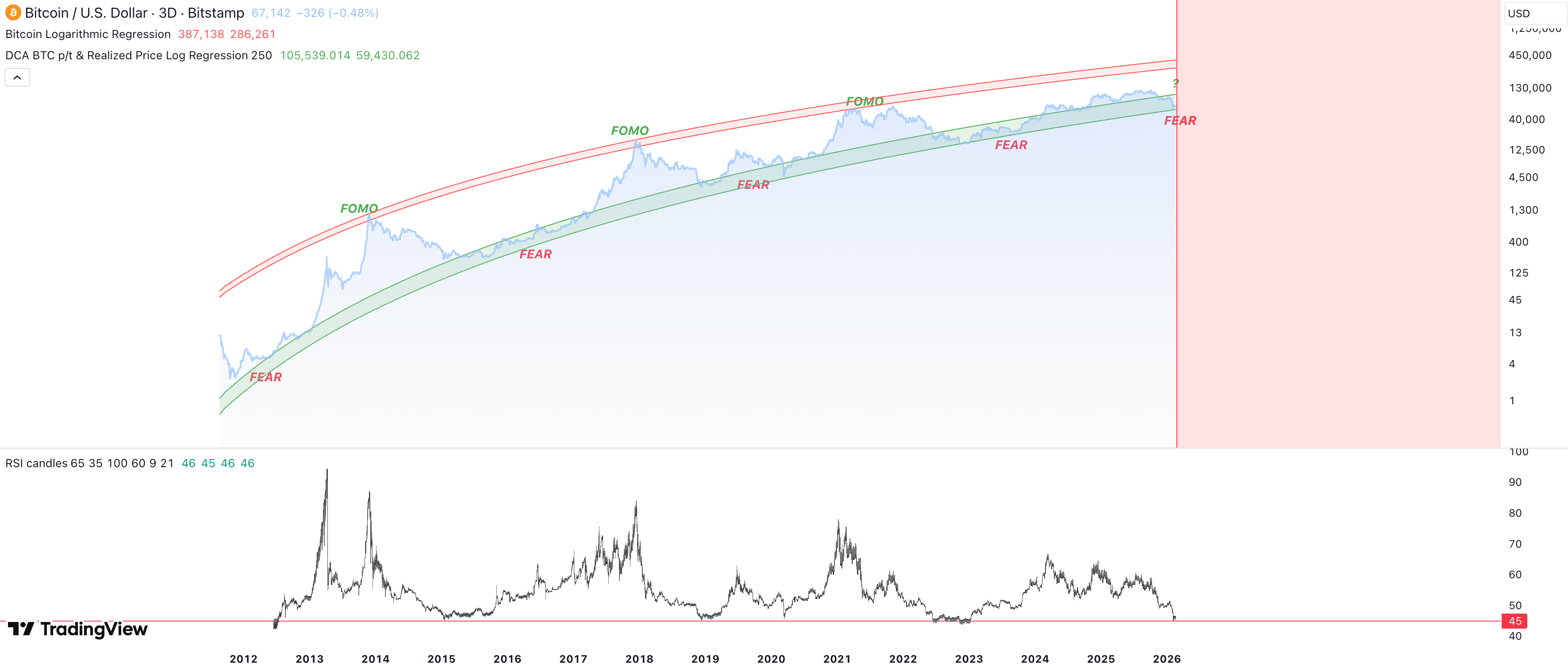 Bitcoin is trading at a "Maximum Financial Opportunity" zone based on historical Logarithmic Band and RSI data. While fear is high, the math suggests the downside is limited compared to the cyclical upside.