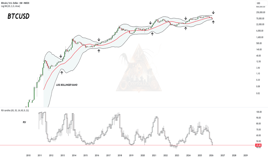 Lower Bollinger Band Test: The price action has retraced to the Lower Bollinger Band. Historically (as marked by the upward arrows on the chart), touching or hugging this lower band indicates the cyclical "accumulation zone." We saw this in 2015, 2019, 2020, and 2022. We are currently testing this zone again.
