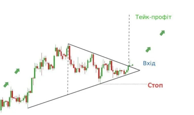 • Трикутники (Симетричний, Висхідний, Спадний): Звуження діапазону, що вказує на швидку розрядку.