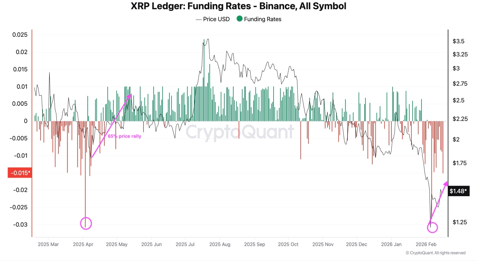 As taxas de financiamento na Binance recuaram para -0,028% quando o XRP atingiu US$ 1,12 em 6 de fevereiro — o nível mais baixo desde abril de 2025.