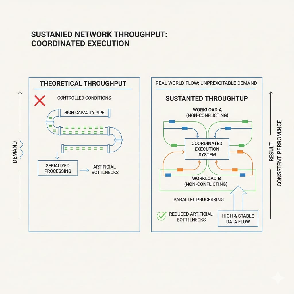 As I continued researching I say to this approach that it reflects a shift from theoretical throughput to sustained throughput. Many networks can demonstrate high capacity under controlled conditions. The challenge is maintaining that behavior when demand becomes unpredictable. They are coordinating execution so workloads that do not conflict can move together. That reduces artificial bottlenecks which often appear in systems that rely too heavily on serialized processing.