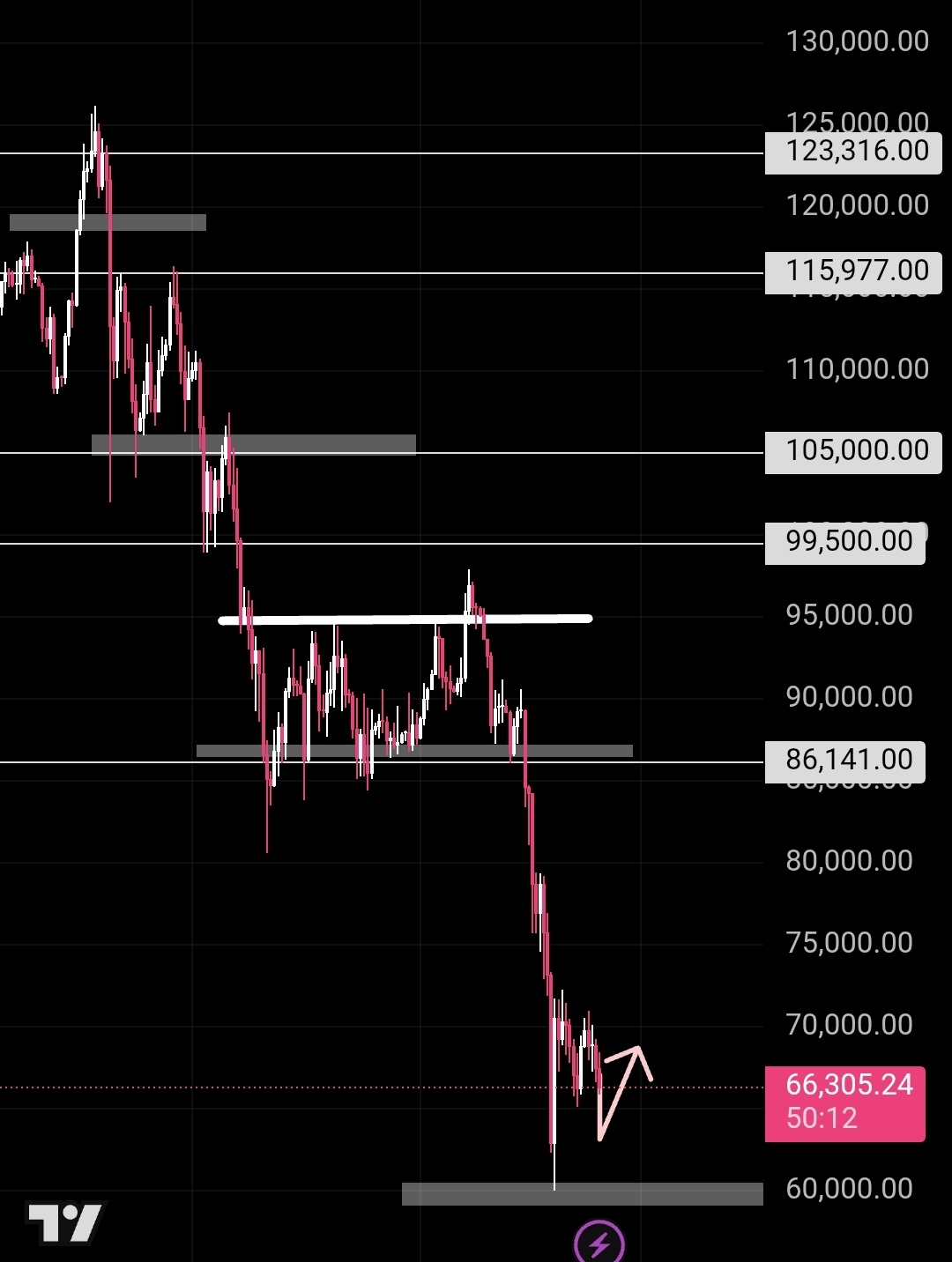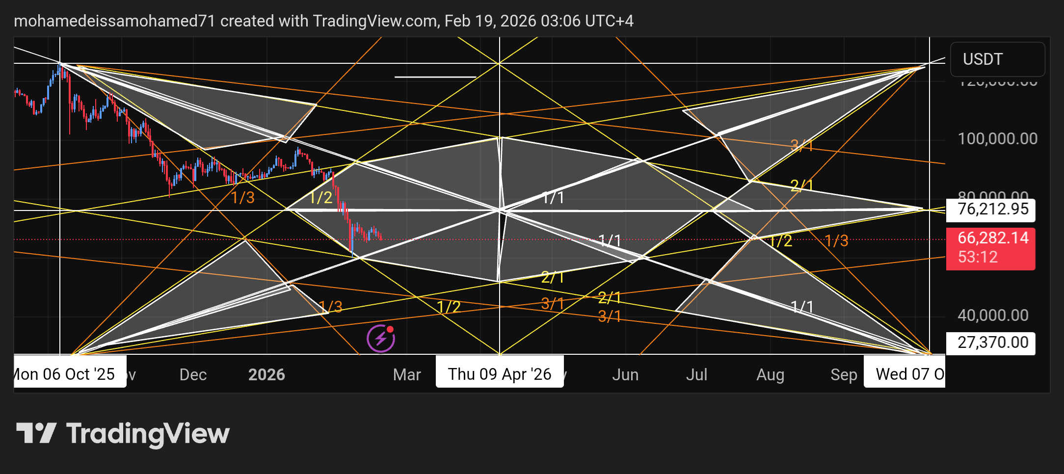 لاكن يأتي الخطر بكسر ضلع المثلث الحالي عند منطقة 60 ألف إذا تم الكسر يبقا هيكمل هبوط عند55975 و هيثبت في ضلع المثلث إللي تحت عند 52522