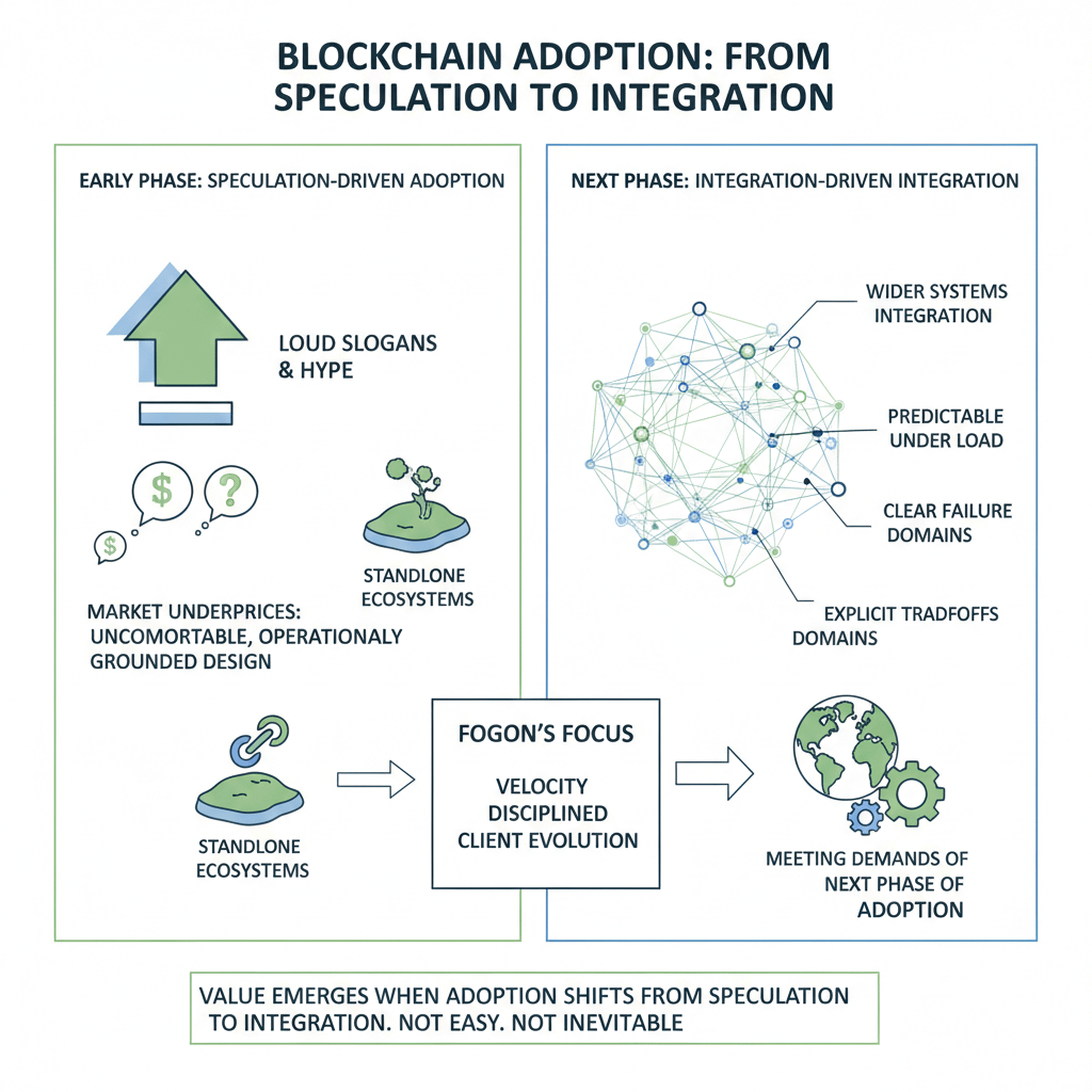 And that’s the macro connection that matters most to me: as blockchains move from being standalone ecosystems into being parts of wider systems, the winners won’t be the ones with the loudest slogans. They’ll be the ones that behave predictably under load, have clear failure domains, and make hard tradeoffs explicit instead of pretending they don’t exist. If that shift continues, Fogo’s focus on velocity, topology, and disciplined client evolution is less about chasing a number and more about trying to meet the demands of the next phase of adoption—without claiming it will be easy or inevitable.