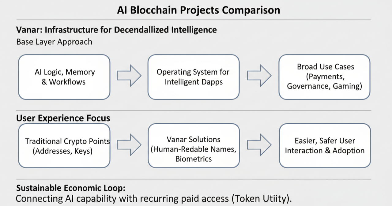 When we compare Vanar to other AI blockchain projects the difference becomes clearer. Bittensor focuses on decentralized machine learning markets. Fetch.ai builds around autonomous agents and coordination tools. Vanar is positioning itself as the base infrastructure where AI logic memory and workflows live natively. It feels less like a marketplace and more like an operating system for intelligent decentralized apps.