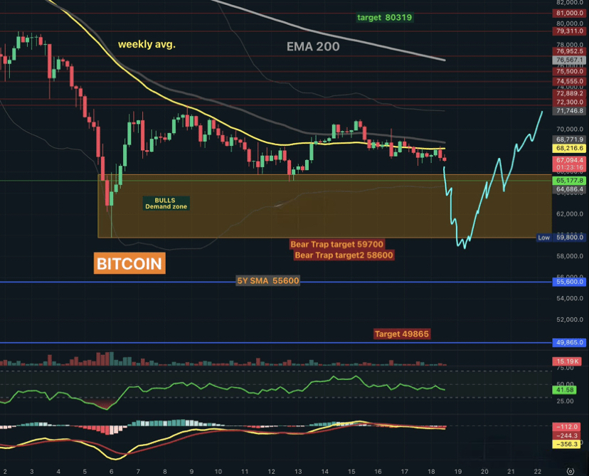A liquidity sweep into the $59,700–$58,600 pocket.