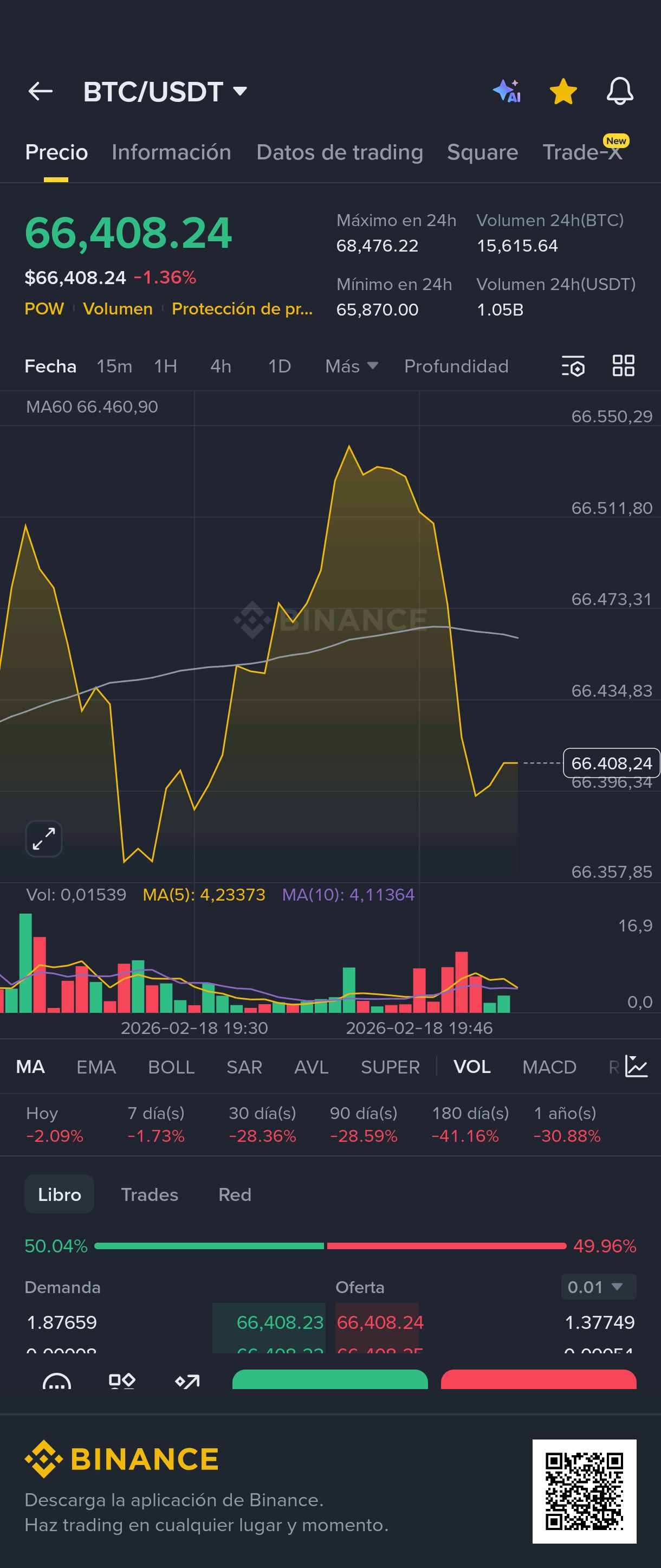 #Bitcoin vuelve a mostrar volatilidad tras ser rechazado en la zona de los 68,400 USDT, y actualmente cotiza alrededor de los 66,400 USDT (-1.36%).