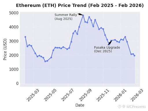 The following chart illustrates the price movement of Ethereum over the last year, highlighting key events like the 2025 Summer Rally and the Fusaka Upgrade.