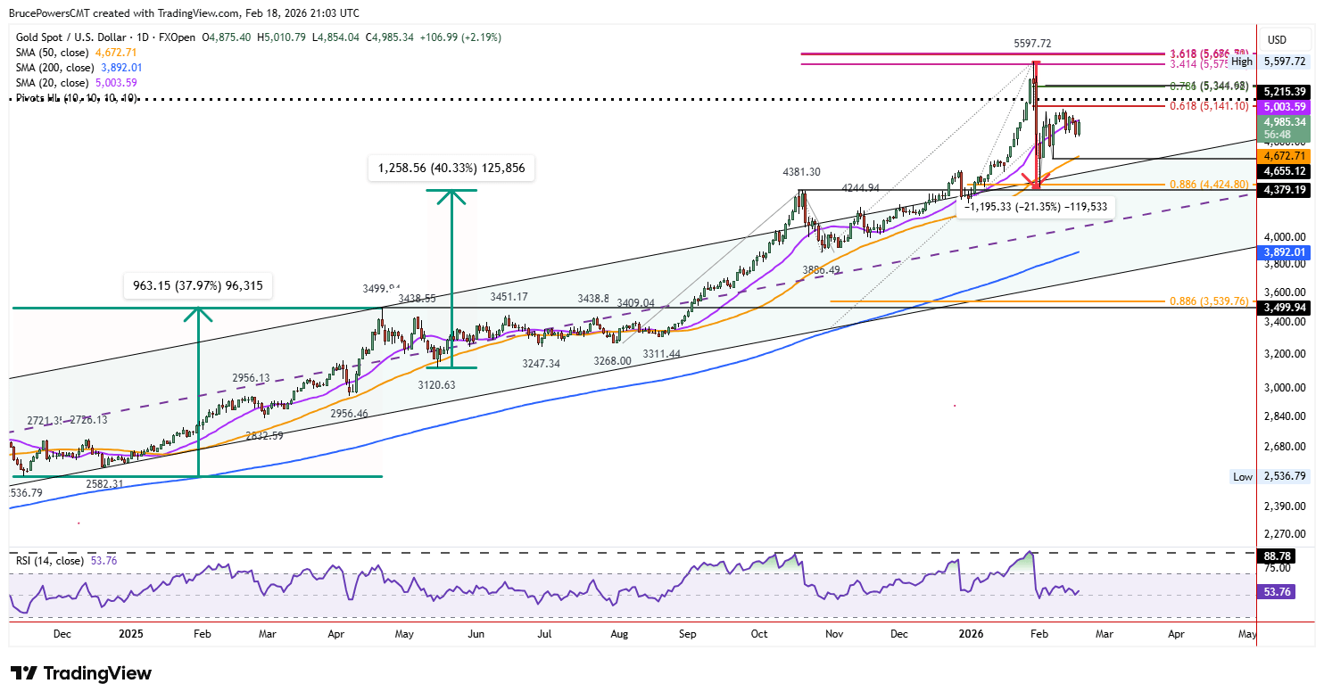 Current Stalemate: Gold tested resistance at the 20-day moving average ($5,003) this week, peaking at $5,011.