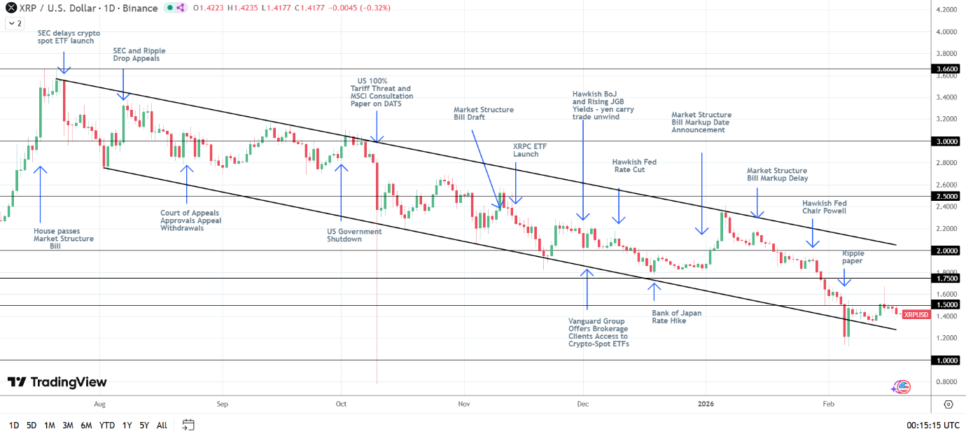 Drivers: Geopolitical tensions, persistent ETF outflows, and any delays in regulatory bills could push XRP toward the $1.0 support level.