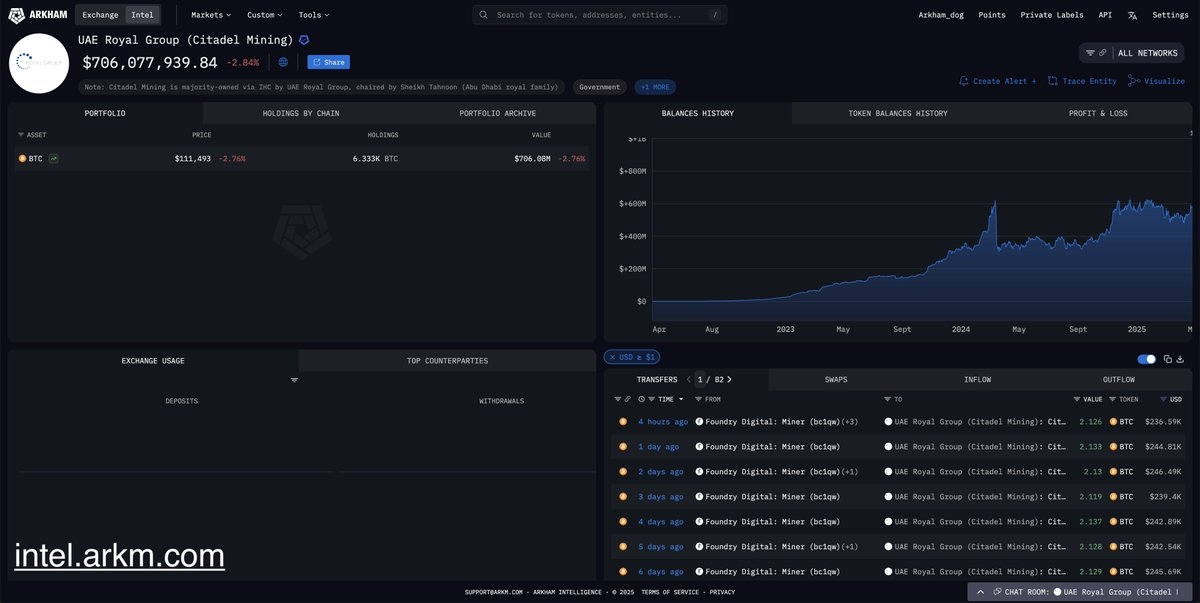 Arkham's on-chain labeling shows these holdings in clustered wallets under the "UAE Royal Citadel" entity. Daily block rewards (typically a few BTC) flow into these addresses from mining pools, with minimal selling. The strategy appears HODL-oriented: accumulate mined coins as a hedge or strategic asset rather than liquidate for quick cash.