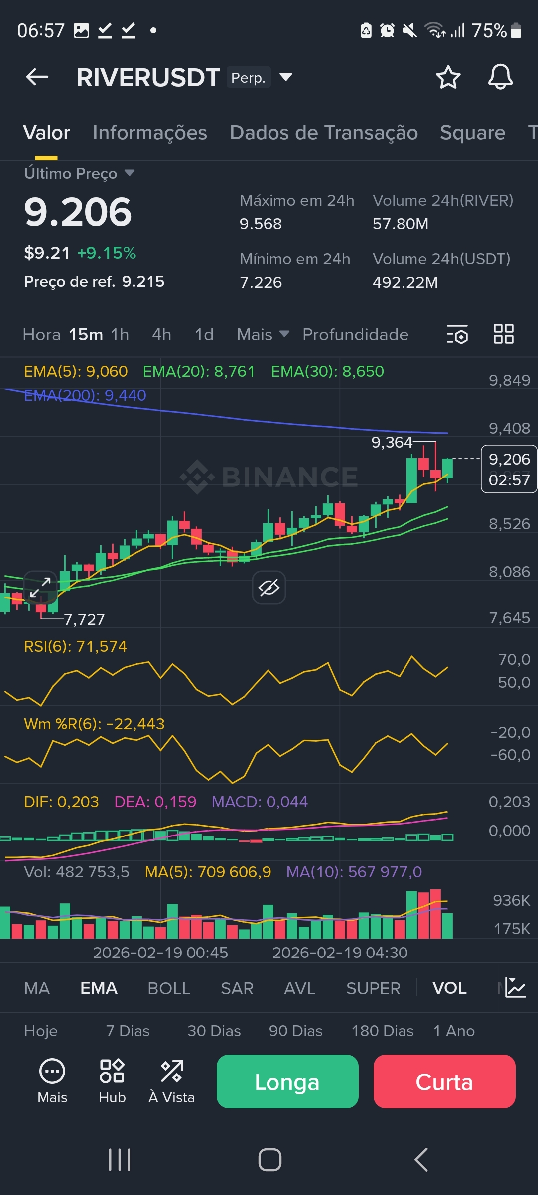 O gráfico de 15M mostra candles com pavios inferiores, indicando absorção de compra na região de 8.800. O preço rompeu a resistência local e busca agora a EMA(200) no gráfico de 1H (12.957), que atua como resistência macro.