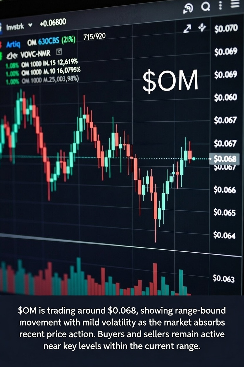$OM is trading around $0.068, showing range-bound movement with mild volatility as the market absorbs recent price action. Buyers and sellers remain active near key levels within the current range.