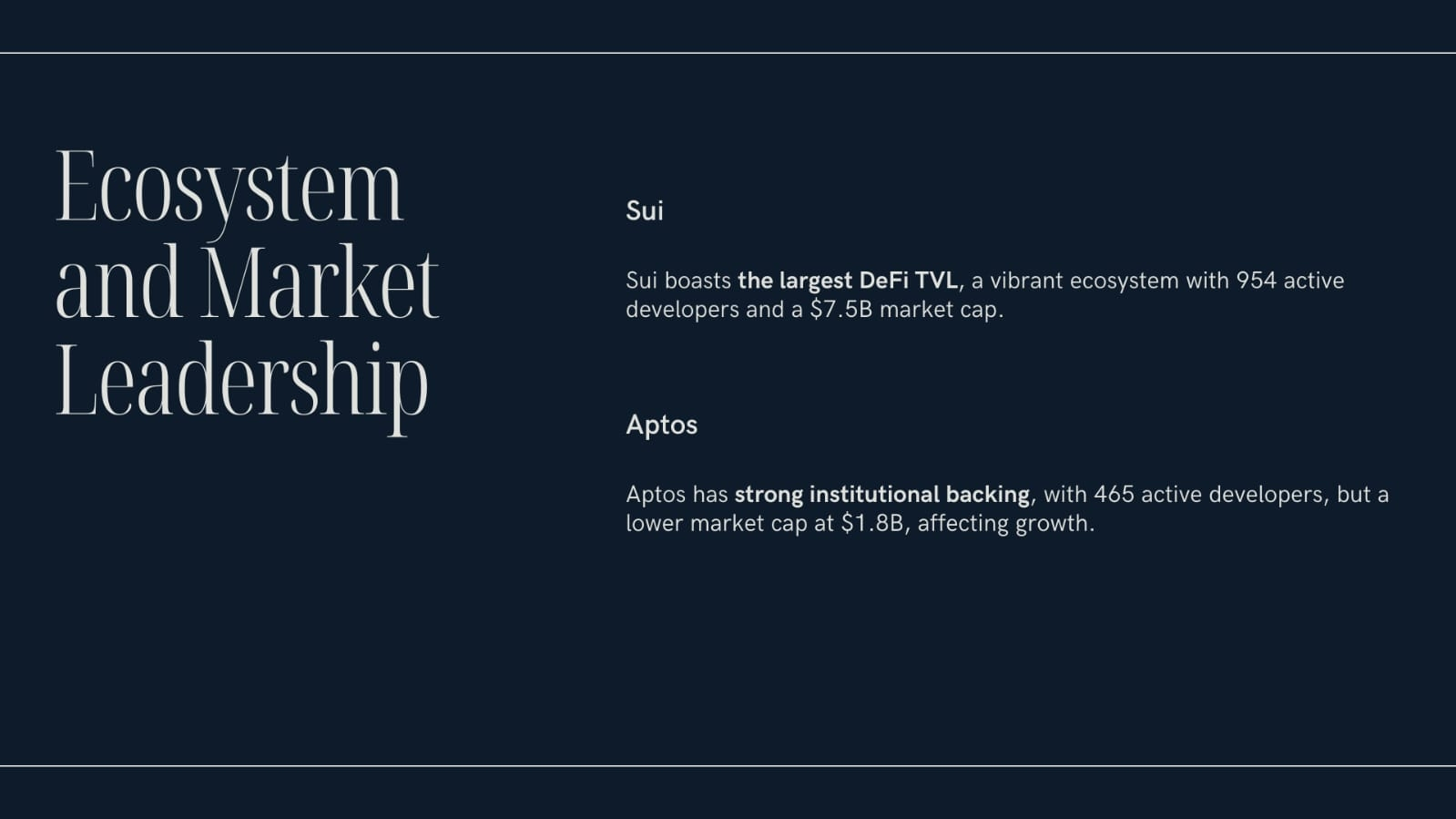 Sui was formed out of Mysten Labs, the company of former Meta engineers. It implements a data model based on custom objects and a consensus protocol, called Mysticeti, based on a DAG that does not rely on consensus when performing simple transactions. The outcome is smouldering throughput under perfect circumstances - theoretical maxes of 297,000 TPS. By early 2026, Sui will have about 7.5 billion in market cap, be the largest in DeFi by TVL, number of developers, and volume in its DEXs and has developed one of the most active ecosystems in the crypto industry.