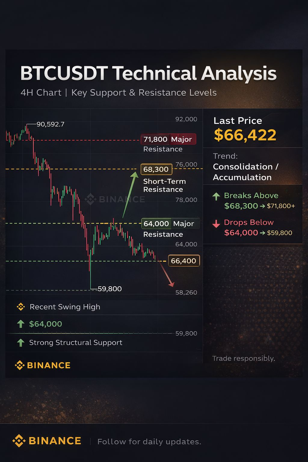 $BTC Bitcoin is currently trading around $66,400, showing signs of short-term consolidation after a sharp correction from the $90,592 high. The market formed a strong swing low near $59,800, which now acts as a major structural support. Price is ranging between $64K–$69K, indicating accumulation before the next impulsive move. Volume suggests buyers are gradually stepping in near support zones.