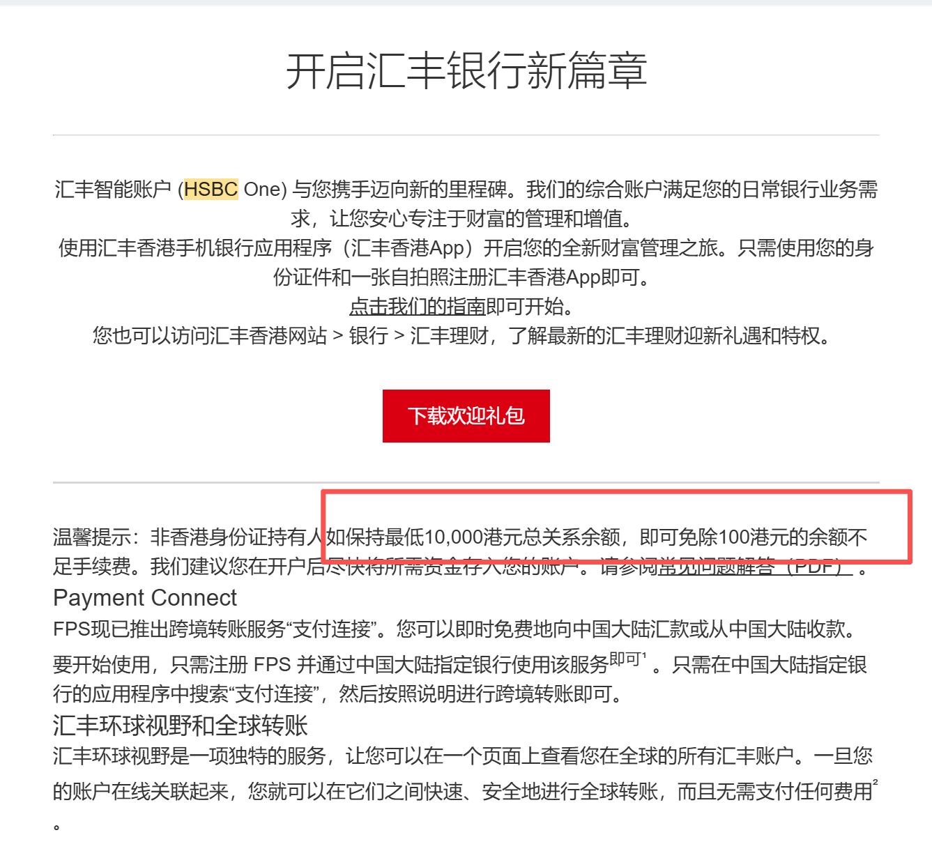 汇丰:建议保持 10000 港币以上,低于收 100 港元/月管理费