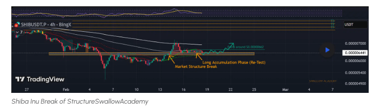 However, something interesting happened. Instead of another lower low after consolidating, SHIB headed northward, breaking the market structure. On February 14, it broke above its previous lower high of $0.00000648, reaching $0.00000725.