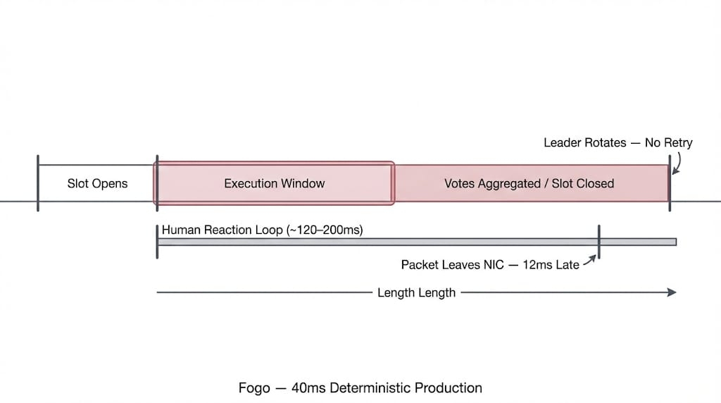 My intent missed the deterministic inclusion timing boundary. It wasn't late when I clicked. It was late to the slot-based execution window. Same cluster. Same Fogo canonical validator client. Same Firedancer stack keeping variance flat.