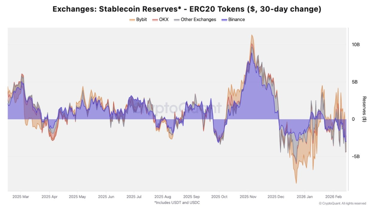 Stablecoin outflows from centralized exchanges have recently cooled significantly, with total reductions of around $2 billion over the past month far lower than the $8.4 billion observed during the market sell-off at the end of 2025. This moderation suggests that capital isn’t leaving crypto altogether; rather, it is consolidating around deeper liquidity pools, especially on Binance.