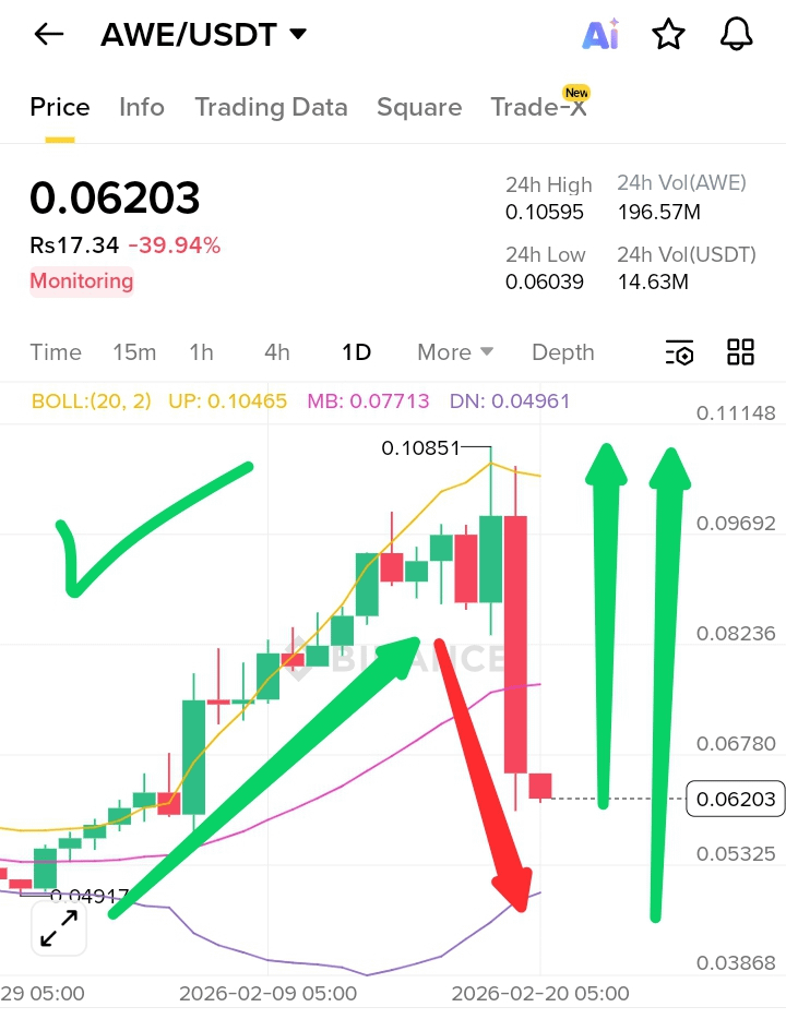 • Price is now near the lower Bollinger region (~0.05–0.06). This zone can act as temporary stabilization support. However, unless $AWE reclaims 0.075–0.080 with strength, upside momentum remains weak. Expect consolidation before any sustainable recovery attempt.