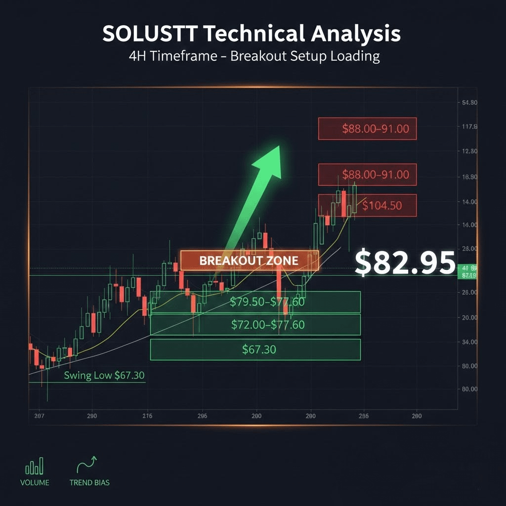 If $SOL breaks and closes above $91 on 4H, momentum can accelerate toward $104+ quickly. However, rejection from $88–$91 may push price back toward $77 support for liquidity grab.