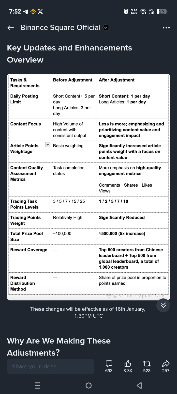 Recently, published an update explaining that rewards would now be distributed among the top 500 creators across all leaderboards. Clear. Straightforward. Structured.