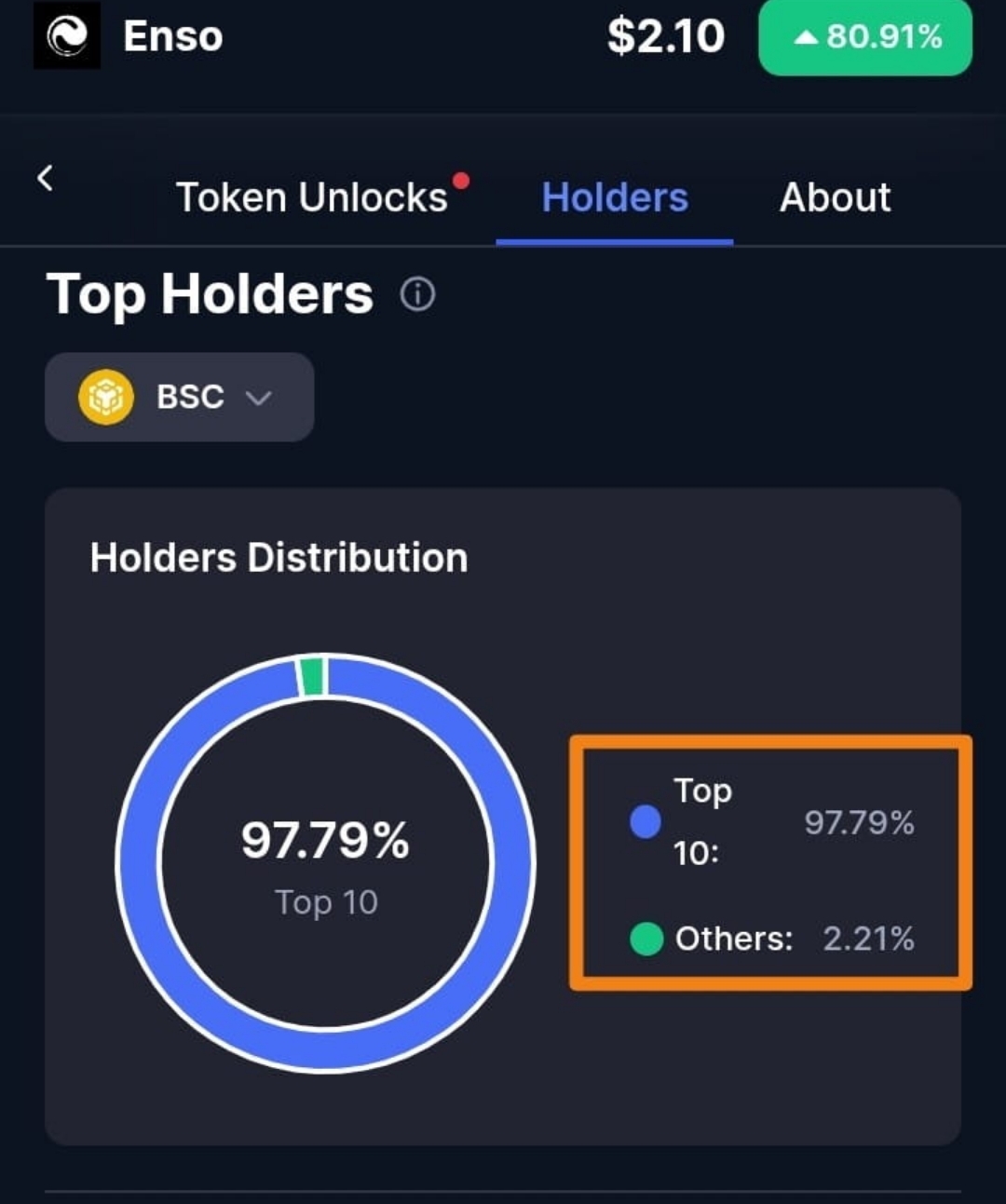 On-chain metrics reveal a startling reality: over 97.79% of $ENSO is held by just the top 10 whales.