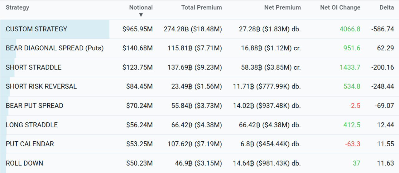 🟡 Na Deribit dominam estratégias como bear diagonal spread, short straddle e short risk reversal — aposta em lateralização ou queda gradual sem longs agressivos