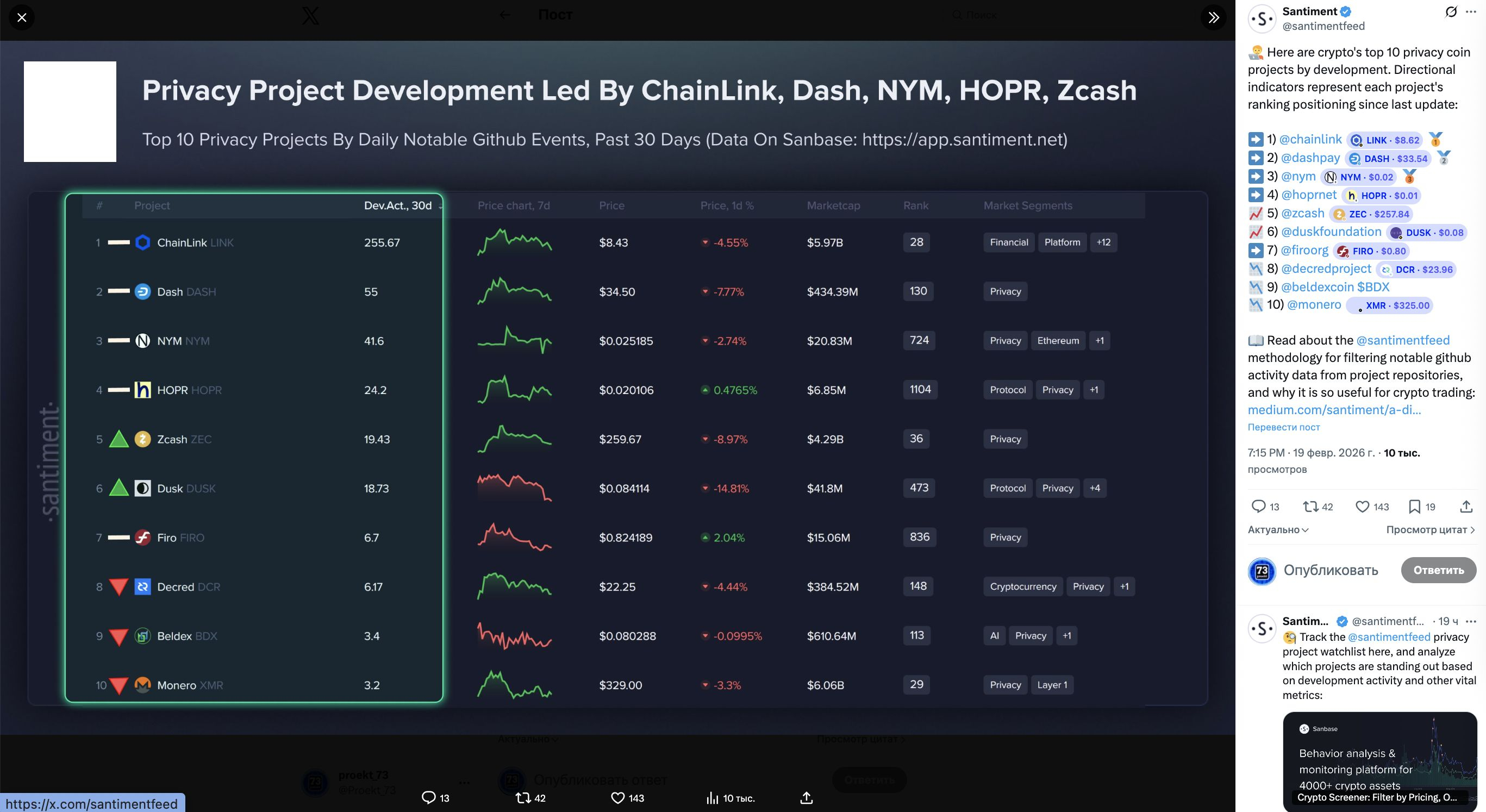 ТОП-10 криптопроектов конфиденциальности по активности разработчиков на февраль 2026. По данным #Santiment - анализу по Daily Notable GitHub Events. Это, напомним, не общее число коммитов, а среднее количество значимых событий разработки в день. Речь про реальные изменения в коде, инфраструктуре и функциональности. Формальные правки и "шум" Santiment обычно отсекает, поэтому метрика хорошо показывает, где действительно идет инженерная работа.