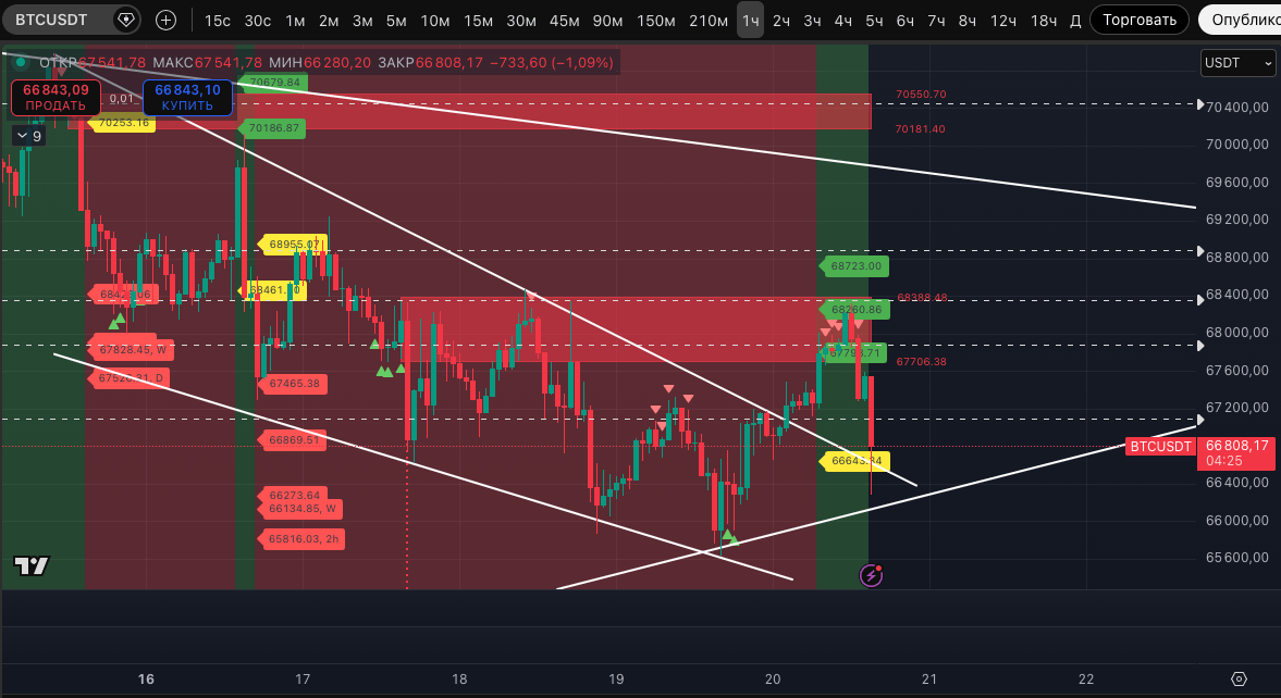 Пока, как видим, #BTC и крипторынок в целом отреагировали снижением. Курс BTC провалился в устойчивый даунтренд уже на 30-минутном ТФ, а пока мы готовили пост - уже и отработал его базовые цели и отскочил от лоя 66 280$.