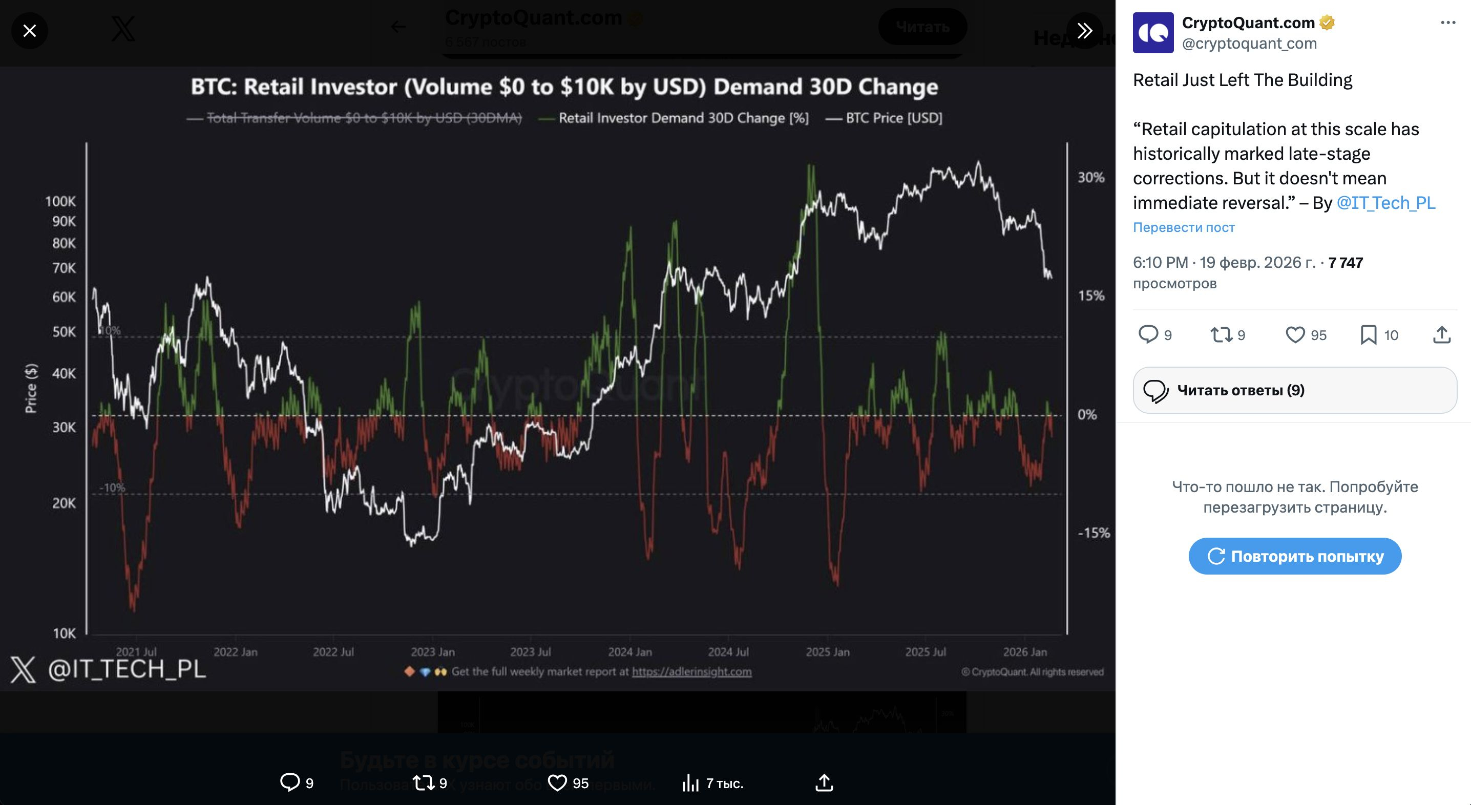 CryptoQuant: розничный участник почти вышел из рынка, и это часто бывает признаком поздней стадии коррекции BTC.