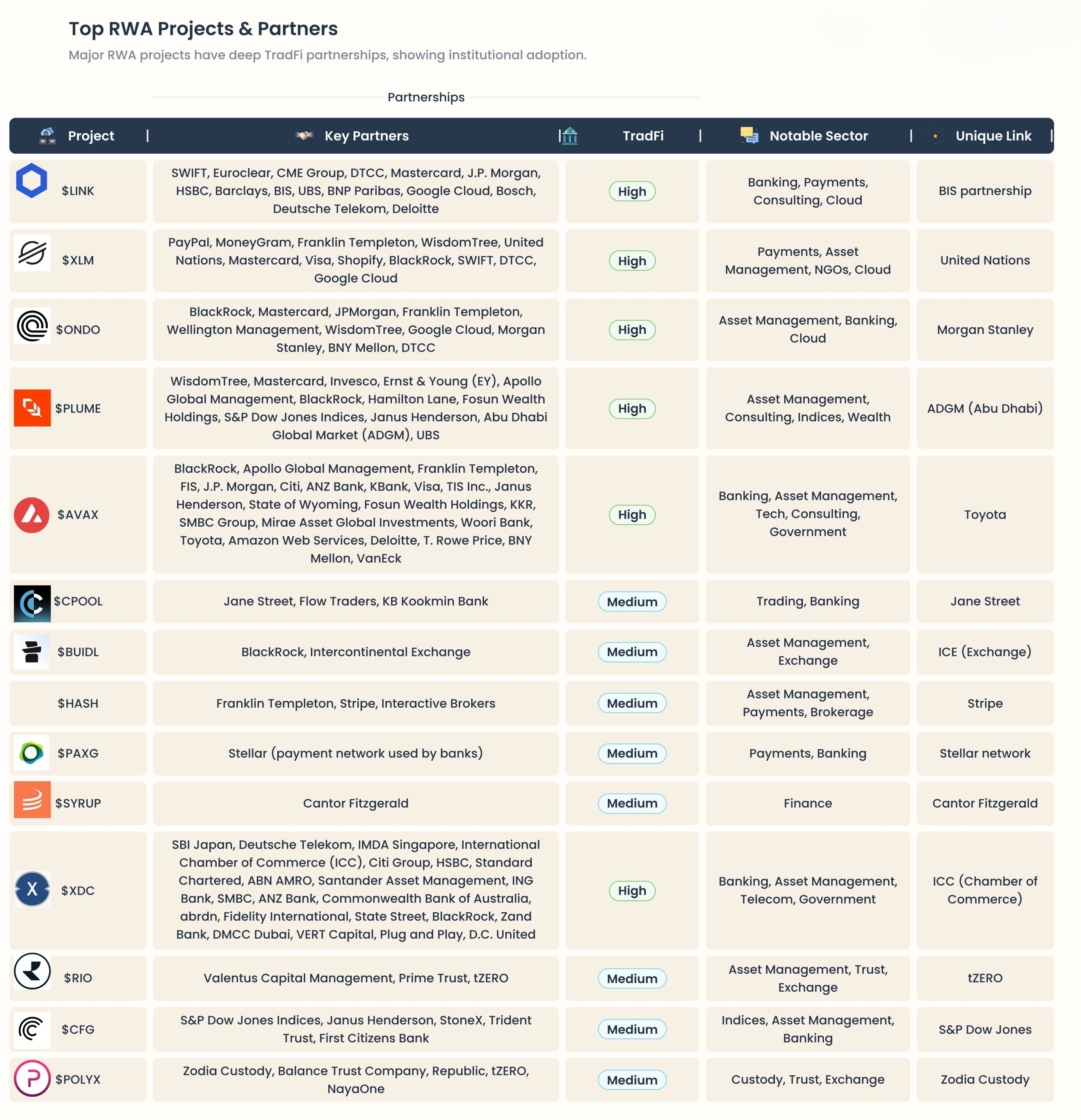 Polymesh ($POLYX) — Zodia Custody (backed by Standard Chartered), tZERO, NayaOne. Built specifically for regulated securities tokenization.
