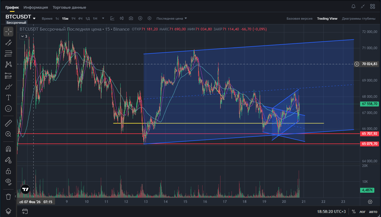 #ВТС сегодня 20.02.2026 оттолкнулся от нижней границы флетового канала 65700 и продолжает свою коррекцию к 71500.