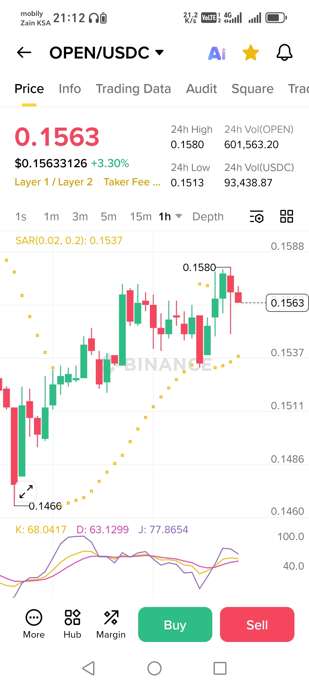 The visual price ladder on the chart highlights the immediate battleground. The price of $0.1563 sits just above the SAR (Parabolic Stop and Reverse) indicator line, which is resting at 0.1537. For traders using the SAR, the fact that the price is above the dotted lines is a classic bullish signal. It implies that the trend is intact and that the recent upward move has enough traction to potentially continue. However, the "More, Hub, Margin" interface suggests this is a dynamic trading environment where leverage might be in play, increasing volatility.