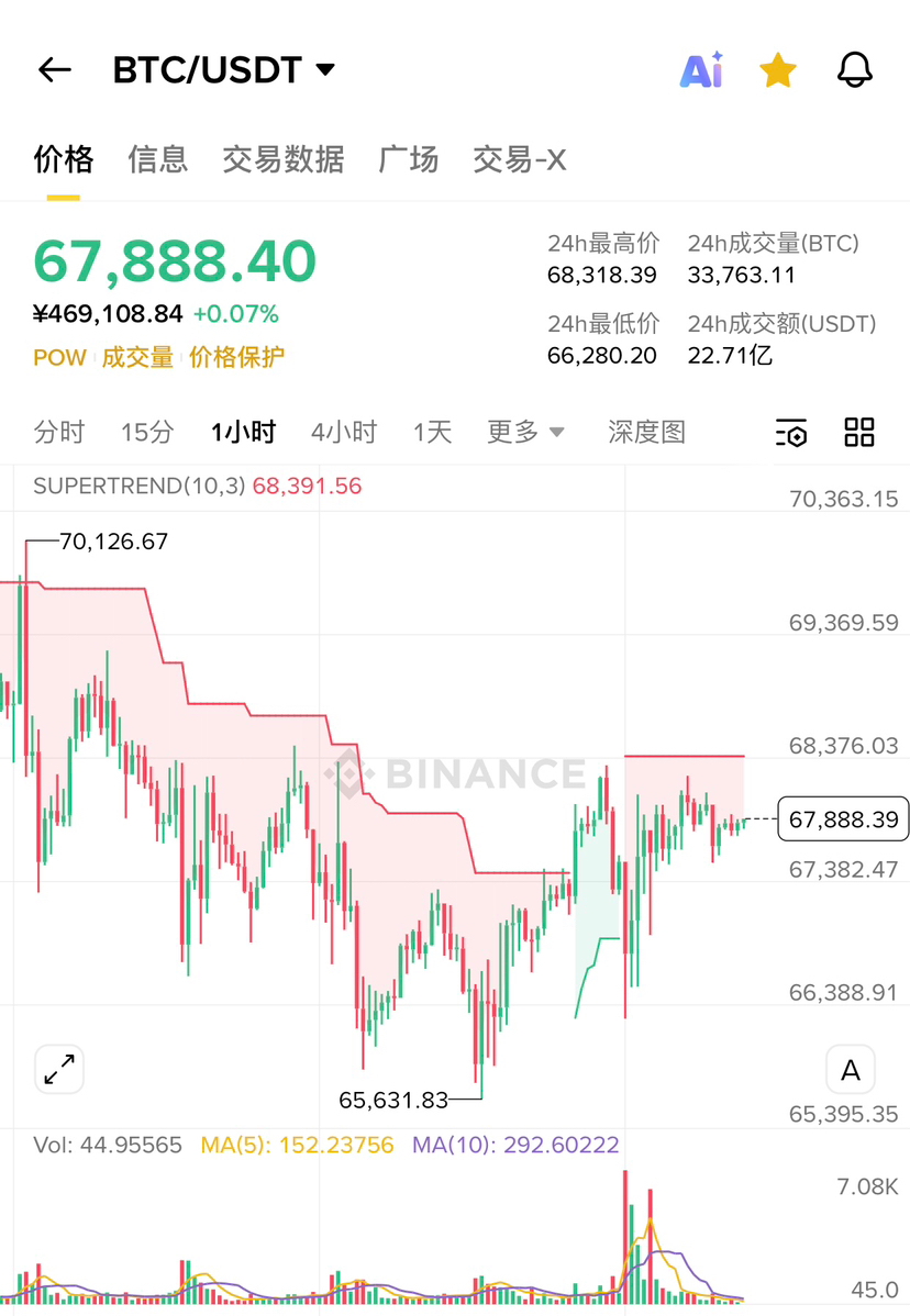 * BTC (67,888): 精准爆头。1小时图上,刚才那根阳线最高拉到 68,376,极其精准地撞在 SuperTrend 阻力线 (68,391) 的枪口上,随后瞬间收长上影线回落。这说明上方的空头防线是铁板一块,根本不给大饼任何喘息的机会。只要这根红线不翻绿,现在的震荡统统视为“诱多派发”。