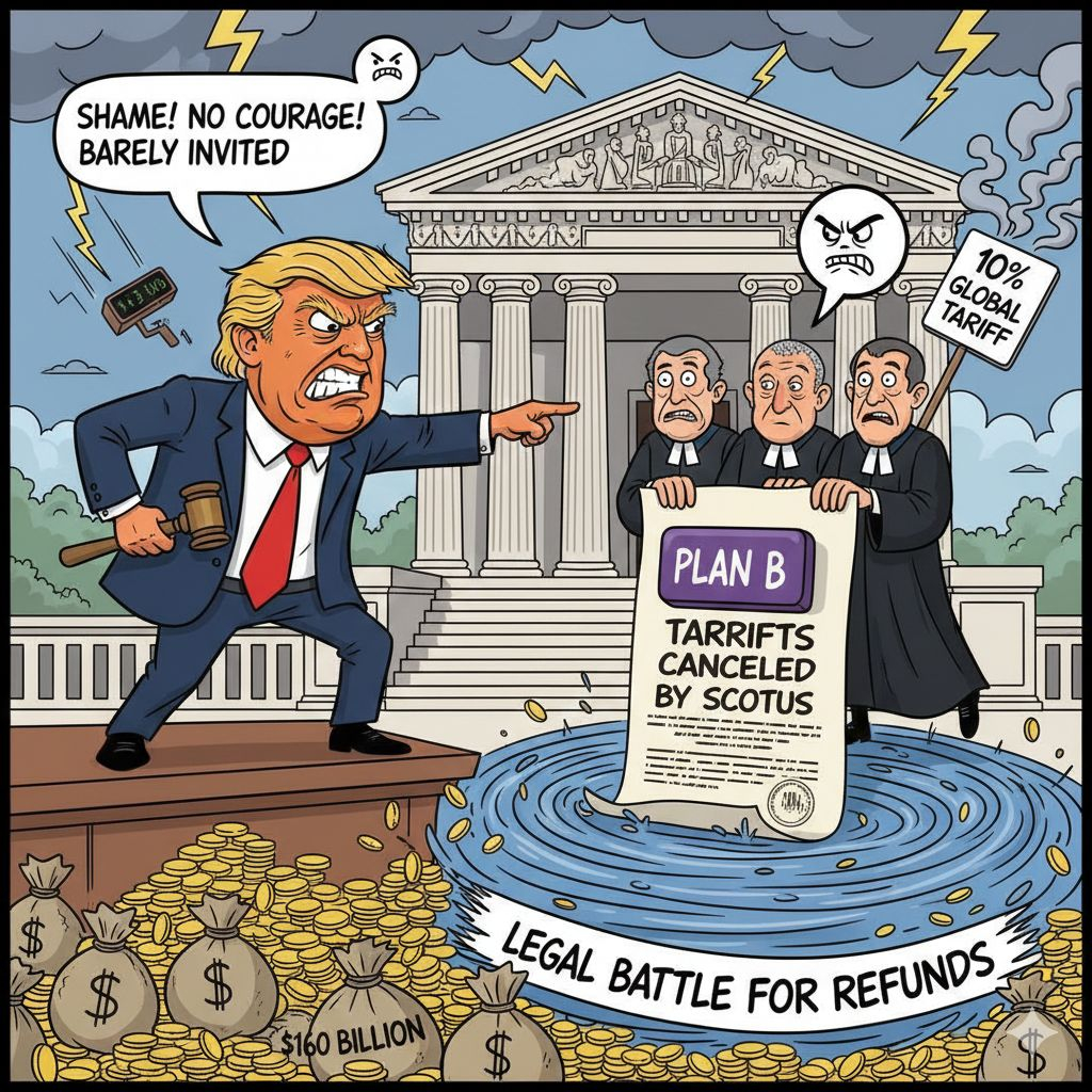 🔄 План «Б» запущен: Спустя всего несколько часов после вердикта Трамп подписал новый указ о введении глобальной 10% пошлины, но уже на основании другого закона (Section 122). Правда, этот маневр ограничен сроком в 150 дней.
