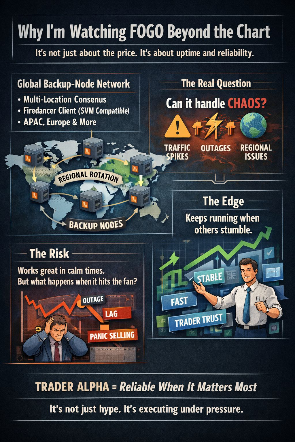 Here’s how I’m framing it in my own head. If Fogo’s whole global backup-node setup actually does what it claims — keeping things running when regions go down or validators get stressed — then the payoff isn’t just “cool infrastructure design.” The real edge is execution that still works when everyone else is scrambling. That’s trader alpha. That’s not some nerdy backend detail.