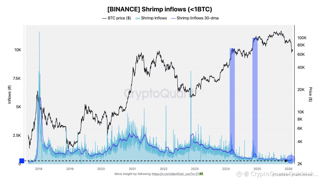 The absence of retail investors, often referred to as shrimps, has been widely discussed throughout this cycle. This group represents the smallest BTC holders, approximated here through all transactions below 1 BTC.