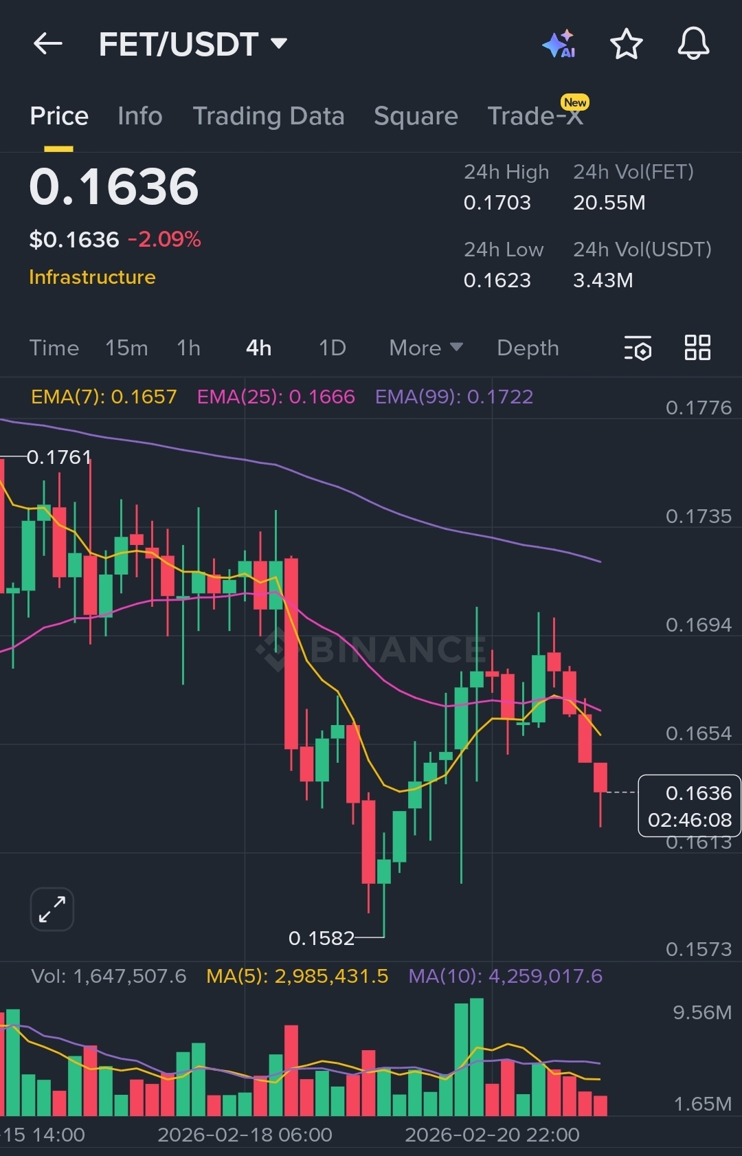 بمراقبة شارت عملة $FET على إطار 4 ساعات، نرى بوضوح أن السعر يتداول حالياً عند مستويات 0.1636. السعر يواجه ضغوطاً من المتوسطات المتحركة، مما يدفعنا للانتظار والترقب بدلاً من الاندفاع. القاع الأخير الذي تشكل عند 0.1582 هو المنطقة التي نراقبها الآن باهتمام كبير.