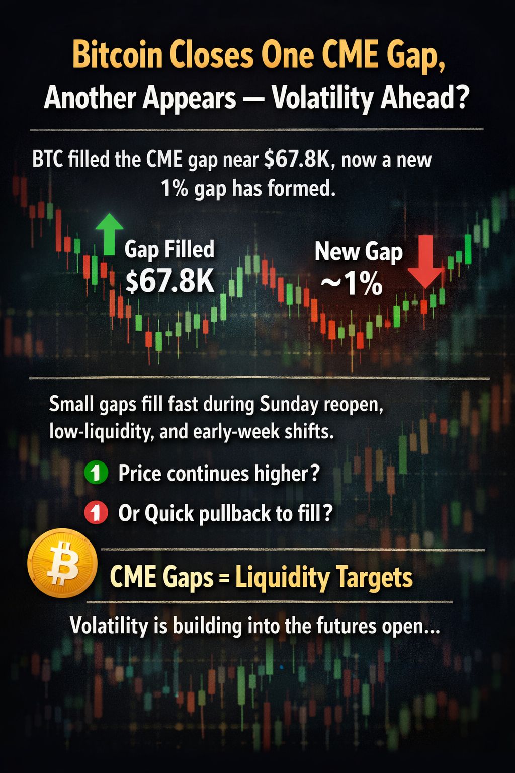 Bitcoin recently filled the CME gap near 67.8K, which is common behavior in futures markets. Soon after, a new gap of around 1% formed, showing how quickly market inefficiencies can shift.