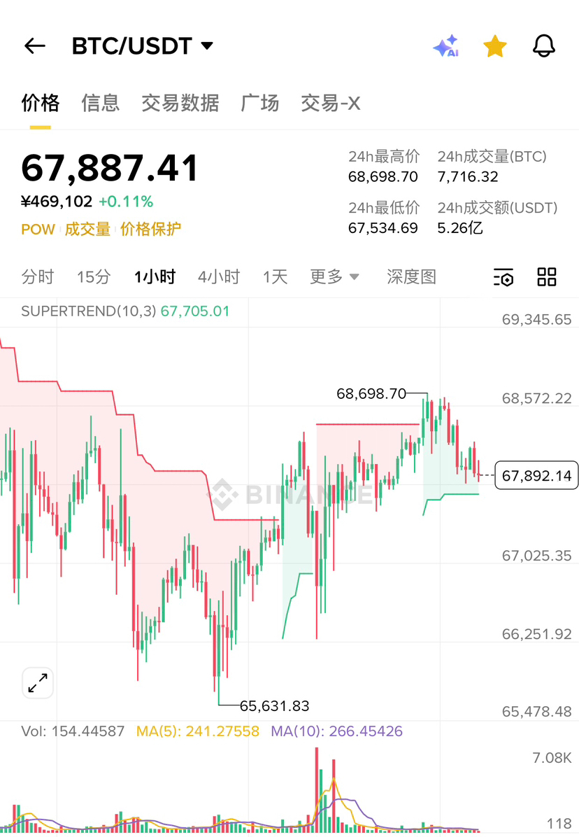 * BTC (67,887): 极度危险。1小时图上,价格正精准踩在 SuperTrend 支撑线 (67,705) 的鼻尖上。从 68,698 的高点一路阴跌下来,MACD 已经死叉向下并且红柱还在放大。这说明空头正在持续施压,67,700 这个位置如果被放量砸穿,绿线瞬间变红,这几天的突破就彻底宣告是“诱多陷阱”。