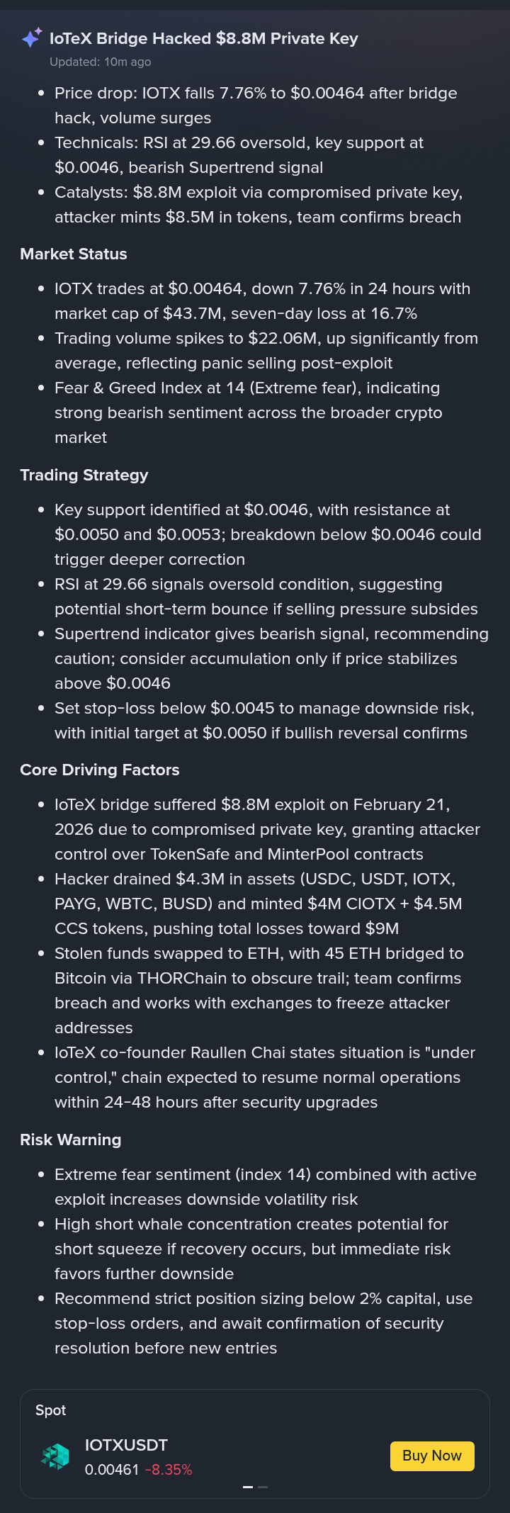 It started normaly — no dramatic warning, no countdown. Then suddenly, the IoTeX cross-chain bridge was bleeding funds.